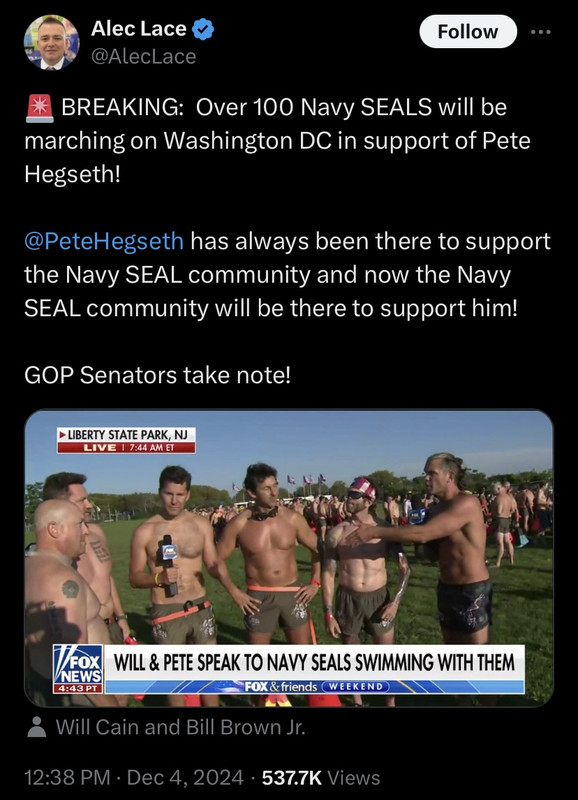 C-Span Caller: “Pete Hegseth’s very brave. He’s gone to Harvard, Princeton. He’s written several books — he’s a multimillionaire. I’m not even sure he really needs this job. This is The Swamp fighting back because they can’t continue to line their pockets if Pete is actually doing something about it.”