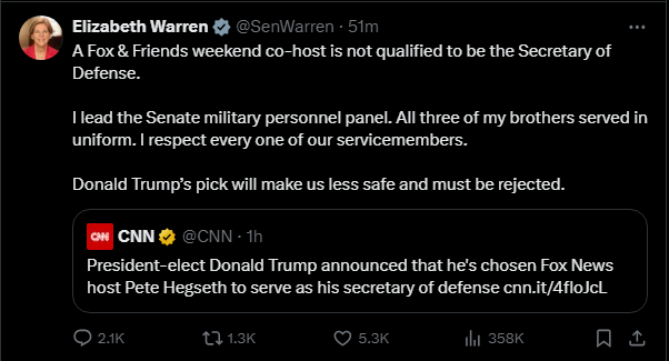 Pocahontas steps in it Bigly trying to smear Nominee Pete Hegseth as Sec Dec. Enjoy your laugh.