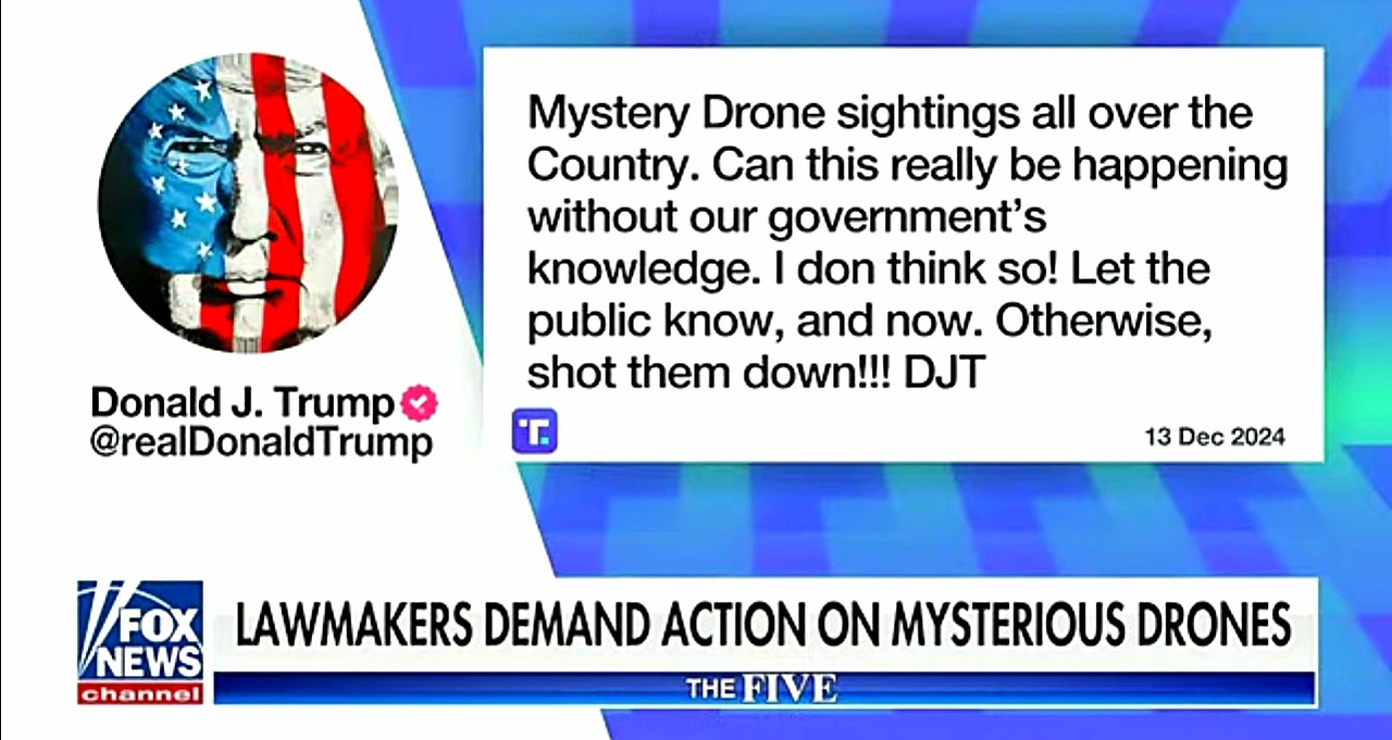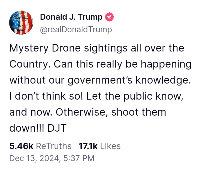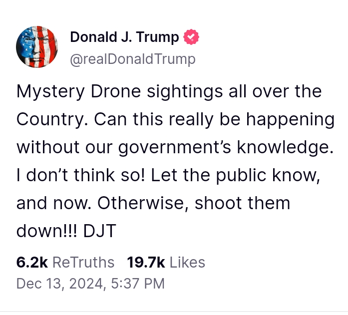 He wrote: ‘Mystery Drone sightings all over the Country. Can this really be happening without our government’s knowledge. I don’t think so! Let the public know, and now. Otherwise, shoot them down!!! DJT.'”……
