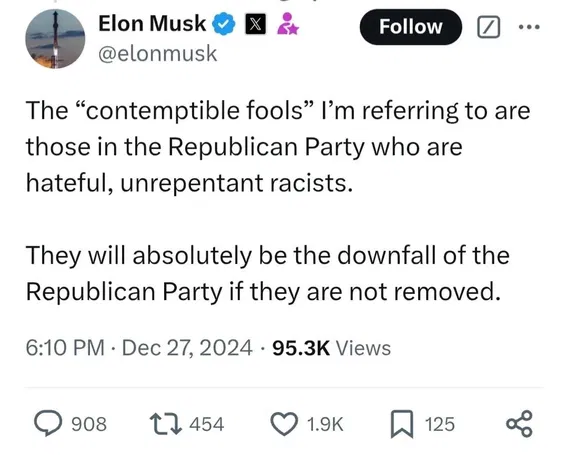 Frankly, Donald Trump is a fool to side with Musk on this issue. A fool. It is the opening the Republican party can use to ditch him.