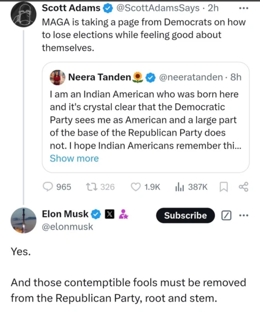 All of that said, it is really outside the discussion at hand, which is about the desire for unfettered H-1B visas. The bottom line for that topic is that Musk and Vivek can go do exactly what Musk suggested Americans do. We know the truth regarding the visas and we aren’t buying their crap or bowing to their threats. The H-1B program is nothing more than a compliant slave labor conduit – always has been. If exceptional talent were truly a need, that is what the O-1 visa program is for. Even it needs severe modifications, as the included fields are far too broad and include arts and humanities.