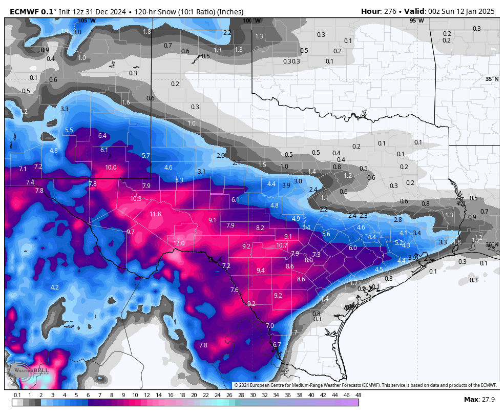 Euro still all in on Texas snow around the 10th along with 15 to 25 below normal for 5 days and freeze into valley. Been alluding to this for over a week