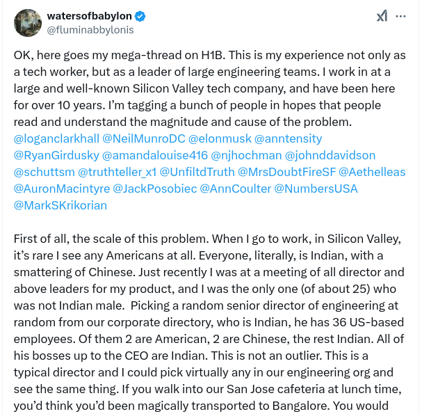 What we have researched with Elon Musk carries many of the same background datapoints and nuance. Musk takes popular positions to cover for some very un-MAGA proposals; the H1B issue is just one facet. Overall, a technological system of surveillance and control by a few tech oligarchs is well underway.