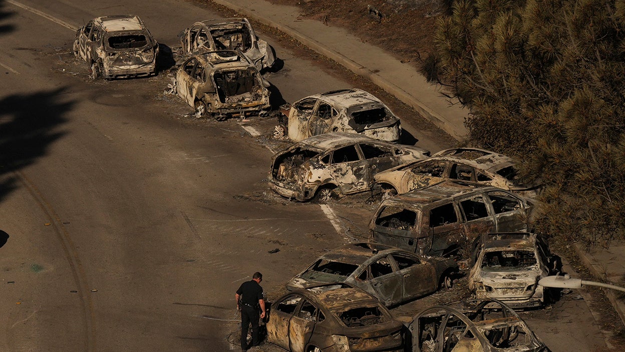 Police officers inspect cars abandoned on Sunset Boulevard during by the Palisades Fire in Palisades, Calif., Wednesday, Jan. 15, 2025.