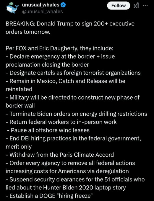 Wife and I are watching everything live on Fox. Our way of celebrating. Emerging from the darkness. Can’t wait for the signing ceremony, where all the EO’s are put into immediate action.