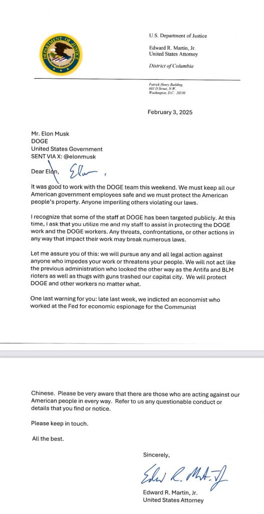 Dear @elon, Please see this important letter. We will not tolerate threats against DOGE workers or law-breaking by the disgruntled. All the best. Ed Martin