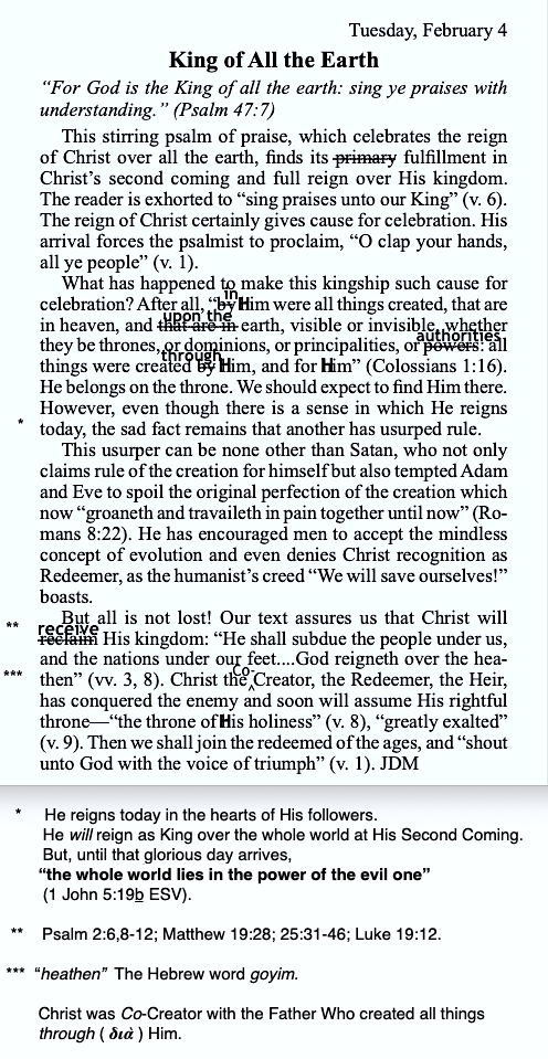 The traditional Protestant view is that He is King now. And He won’t come back any day now, because the most often quoted Old Testament verse in the New Testament, Psalm 110:1 says “He will be seated next to God The Father, and remain seated there until all His enemies have been placed under His feet.” Look around; all His enemies are not yet under His feet. That’s our job to take the Gospel to the ends of the earth and to disciple the nations. It’s called the Great Commission. We believe in the Greatness of the Great Commision. Then, Jesus will return to destroy the last enemy, “death.” I quoted those verses. Take your time and explain to me where I’m wrong, but be sure to use the Bible in your critique.