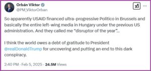 Hungarian Prime Minister Viktor Orban was designated as a target by CIA/USAID revolution efforts for his nationalist mindset and opposition to the global agenda of the European Commission. Orban is also a very strong ally of President Trump and a close personal friend. Today, Prime Minister Orban reacts to the sunlight now unstoppable upon the … Continue reading USAID Target Hungarian Prime Minister Viktor Orban Responds to USAID Revelations