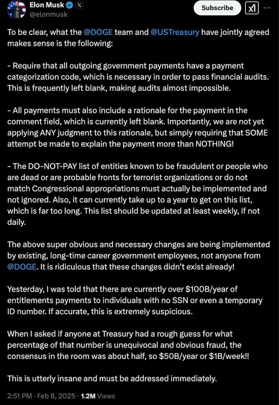 What are the odds we see President Trump go to the Treasury Department, with Elon and the DOGE Crew, on Monday morning and provide them with whatever they want?
