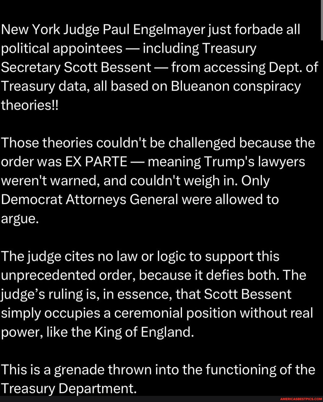 i almost wished bessent would have come right out and said the treasury is part of the executive branch so we will not comply with this order.what would the judge do??he’s in ny.