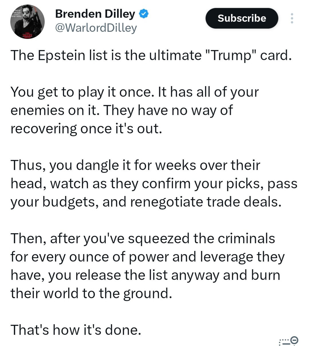 Again, it’s all the “flash” that is hiding what’s really going on. Want to take heat off of the budget? Epstein files, JFK files. Ooooh look, we could release them this Friday. Meanwhile AI digital ID is pushing forward and the congressional “budget” is a mess that’ll get passed.