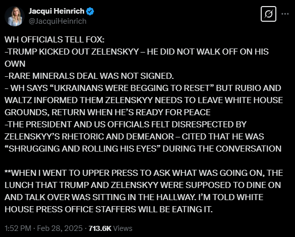 My thinking exactly. Trump doesn’t want to be trapped in a bad deal, so Zelensky actually gave him everything he wanted, namely a way out. Now the real war begins in the shadows– the war between the President and the United States Senate. Senators are not going to sit idly by and watch the President kill off the gravy train. They have little choice but to fight back– but on what turf? My guess is they are going to slow walk his legislative agenda, and his judicial appointments. Do not underestimate the power of Senate committees and subcommittees.