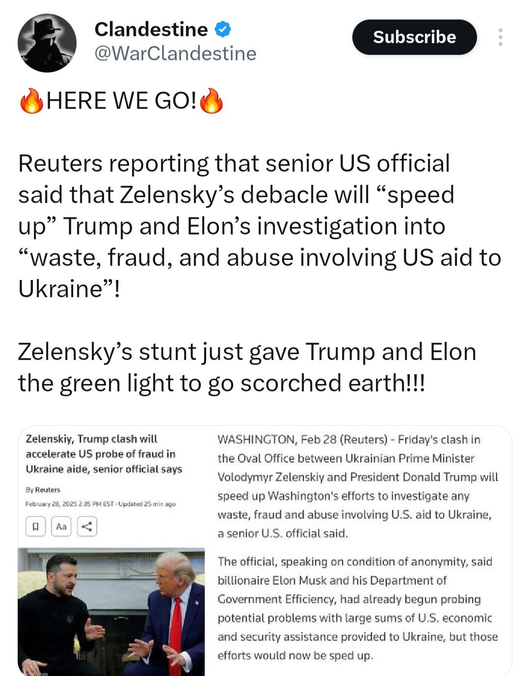 After a heated discussion in the Oval Office where Volodymyr Zelenskyy rejected any proposal for a ceasefire and expressed his sense of power that stems from a legislative branch supporting his futile war by proxy.