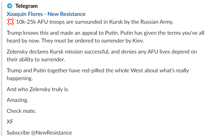 “We have read today’s appeal from President Trump to spare the lives of servicemen of the Ukrainian Army in the Kursk region. In this regard, please note that Ukrainian militants have committed numerous crimes against civilians. These acts, as I have already stated, are classified by us as terrorism. At the same time, we are sympathetic to President Trump’s call to be guided by humanitarian considerations regarding these servicemen. In this regard, I emphasize that if they lay down their arms and surrender, they will be guaranteed life and dignified treatment. To effectively implement President Trump’s call, there must be an appropriate order from the military and political leadership of Ukraine to its troops to lay down their arms and surrender.” ~ President Putin