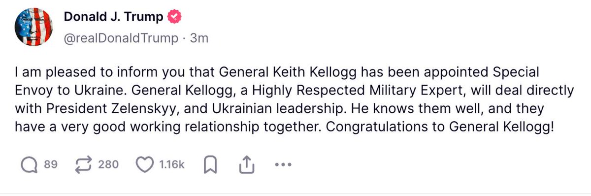 President Donald Trump has announced via Truth Social that General Keith Kellogg will serve as Special Envoy to Ukraine.