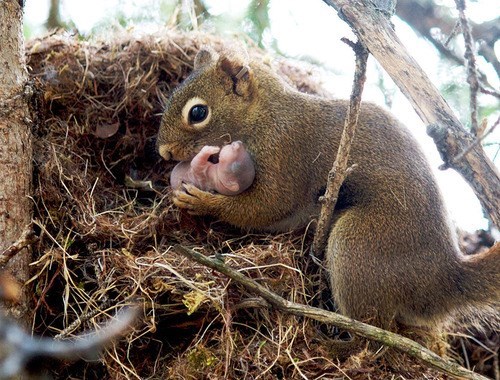 At 10:30 my husband gets dressed, goes outside, puts the ladder up against the house and climbs it with a crowbar in one hand, and rips off the newly installed trim looking for where momma squirrel can get inside and take care of her babies.