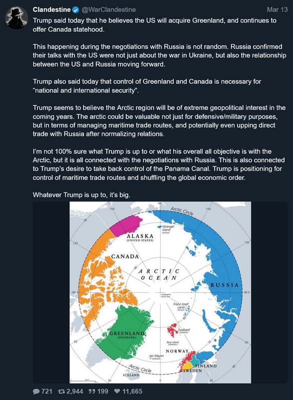 It’s a mistake to analyse this issue on a political opinion level, it’s a geostrategic issue. Trump wants Canada apart from Ontario and Quebec because that plus Greenland plus what’s left in the US = mineral wealth equivalent to Russia + Greenland gives the US strategic overview of the NorthWest Artic trade route Russia has been building in the same way the Houti’s have a strategic overview of the Bab el-Mandeb strait and the Iranians have a strategic overview of the Strait of Hormuz.