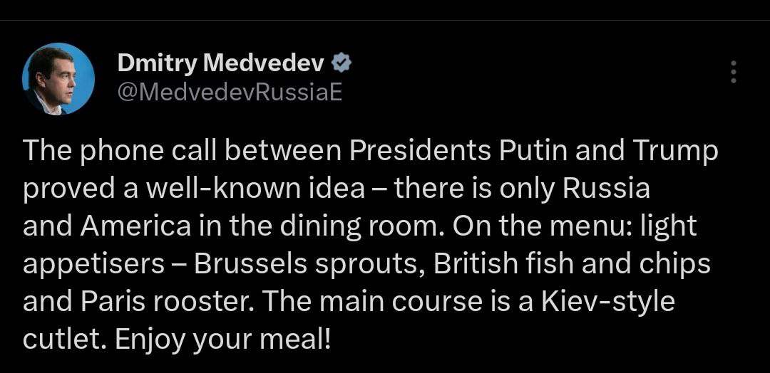I often get a laugh out of Medvedev’s rather brutal commentary. His post after the Putin-Trump phone call: