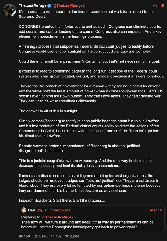 I agree. Our republican Congress has gone soft on these activist judges for too long. But talk is cheap, I see no votes on the floor and nothing seems to be happening to defund the courts. It is disgusting. Hopefully an alphabet agency may be able to go after them and either force them to recuse because of their family involvement in the same criminality they proport to be against: gvt illegally funneling billions of our tax dollars to companies that support the democrat party or are shell climate change companies or NGOs. Everyone is in on it. Totally unbelievable and evil. They should be arrested and put in jail for fraud.