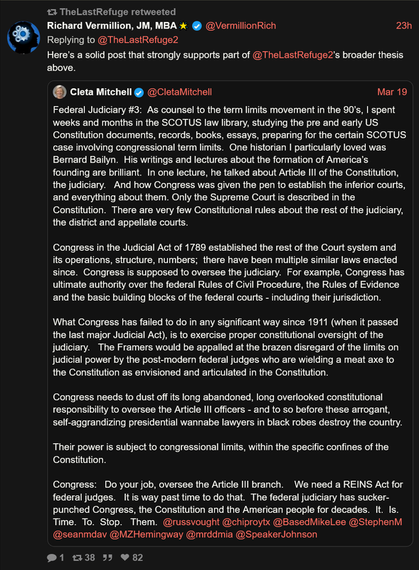 Roberts has responsibility for FISC and all justices have areas of responsibility nationally, but creating and regulating and disciplining the inferior courts is Congress’ job, which they have ignored since 1911 when they last past any legislation regarding the courts.