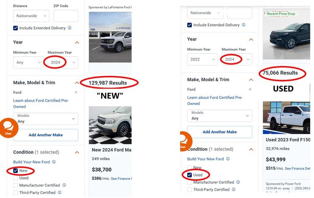 There are currently nearly twice as many, never been driven, “new” 2023 and 2024 model year Fords sitting on car lots, then there are used 2022 to 2024 Fords.