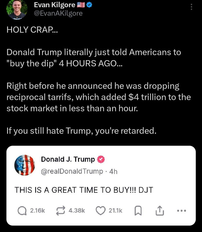 Trump implied in an interview recently that there is no floor to how much he’d let the market fall. The guy has nerves of steel to say that because there very likely IS a floor. He just hoped countries would beg for trade deals before we reached it.
