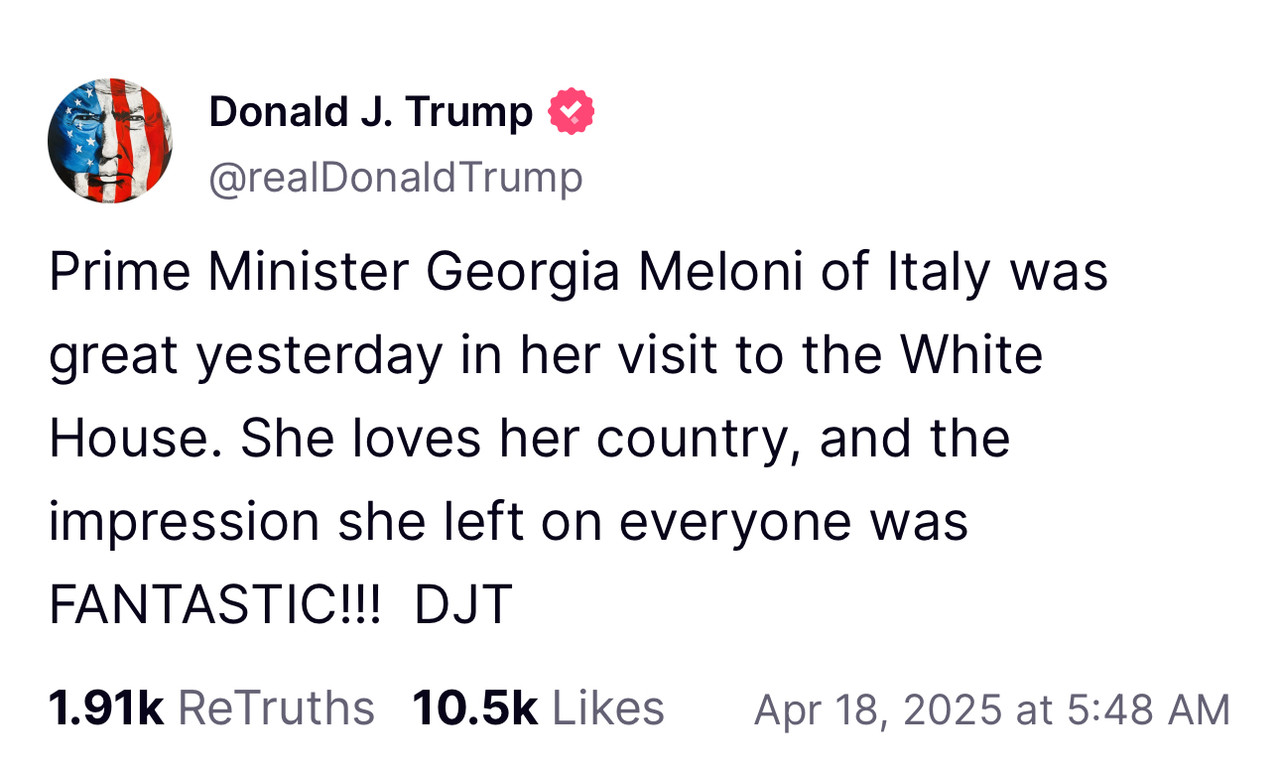 “Prime Minister Georgia Meloni of Italy was great yesterday in her visit to the White House. She loves her country, and the impression she left on everyone was FANTASTIC!!! DJT”
