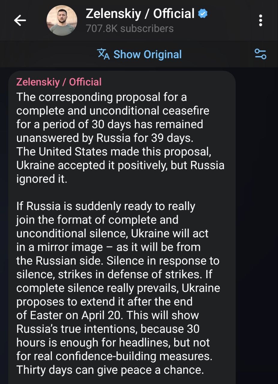 Zelensky has reportedly said Ukraine will not observe a ceasefire. Perhaps he hasn’t received his orders.
