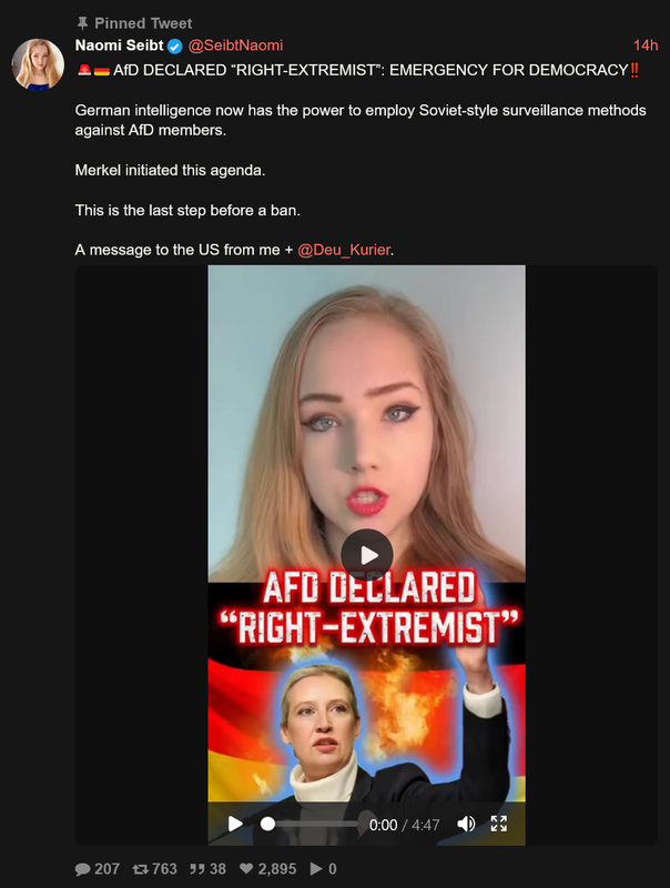 Now, in Germany, the intelligence community produces a report labeling the largest political party as an “extremist” group, taking new power to conduct political surveillance and control the election outcome.