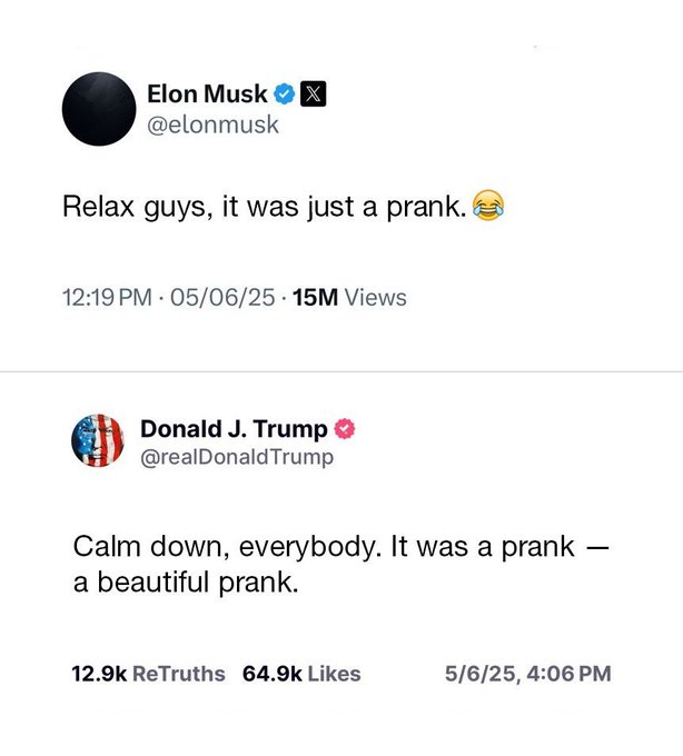 Yet there area Twits saying it was all a prank….Are Elon and Trump on the outs or NOT.