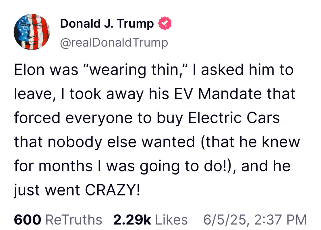 “The easiest way to save money in our Budget, Billions and Billions of Dollars, is to terminate Elon’s Governmental Subsidies and Contracts. I was always surprised that Biden didn’t do it!”