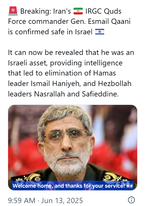 No confirmation in any of the ME MSM. Latest is Iran’s tenth barrage headed Israel’s way and that looks a good hour old.