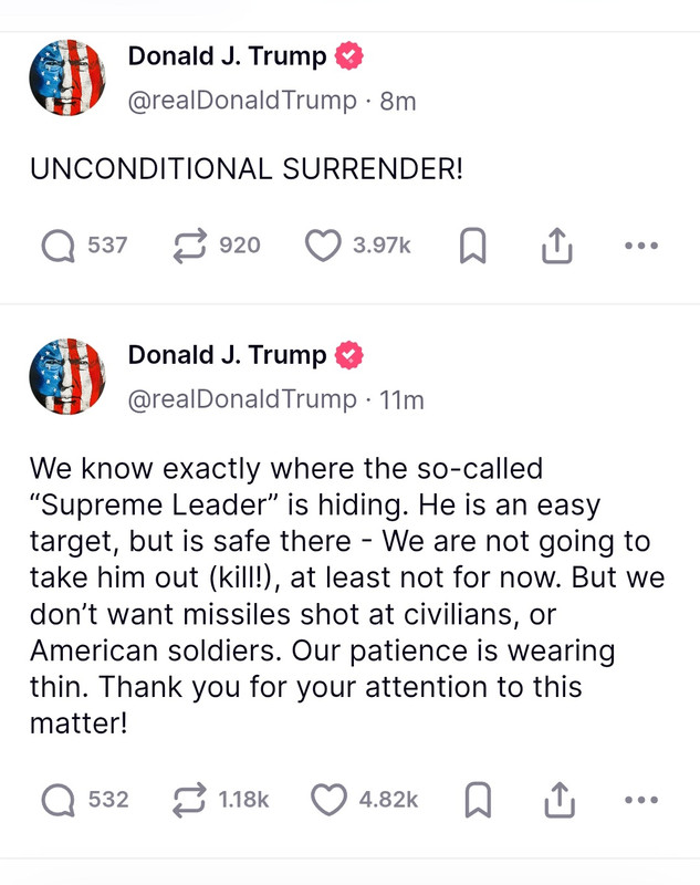 We know exactly where the so-called “Supreme Leader” is hiding. He is an easy target, but is safe there – We are not going to take him out (kill!), at least not for now. But we don’t want missiles shot at civilians, or American soldiers. Our patience is wearing thin. Thank you for your attention to this matter!