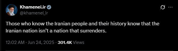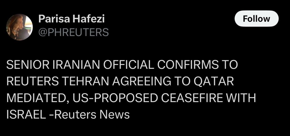 Iran regime trying to maintain their tenuous hold on power agrees to cease fire……..only reason they would do that after all their threats at Israel and the USA is THEY GOT NOTHING now. Israel has complete air superiority and has degraded Iran’s ability to project any meaningful force.