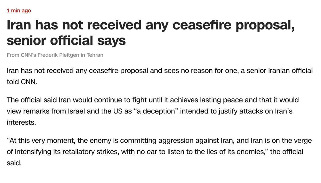 Later, CNN reported that Tehran never received a ceasefire proposal from the United States, citing an Iranian official.