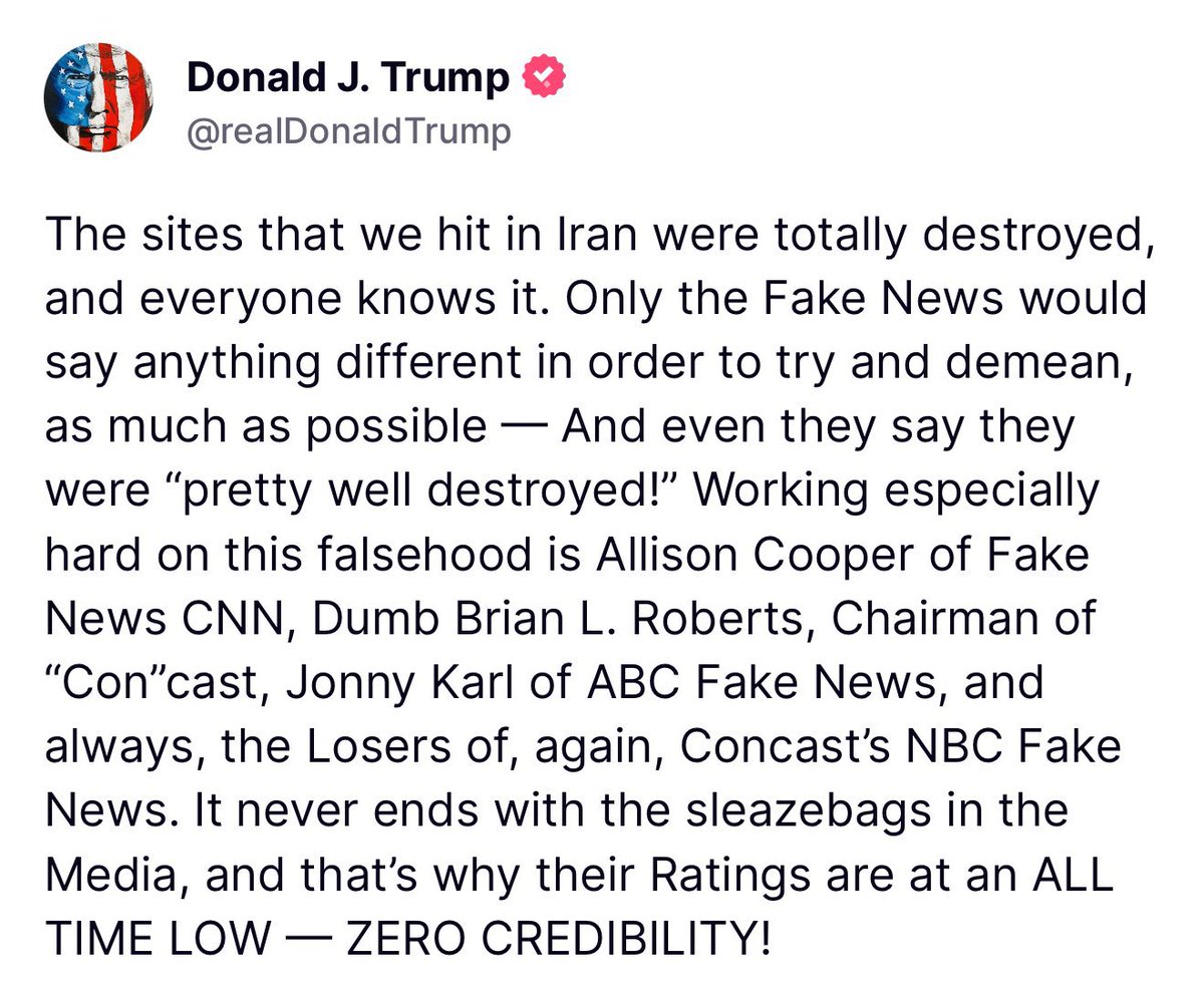 Iran has officially responded to our Obliteration of their Nuclear Facilities with a very weak response, which we expected, and have very effectively countered. There have been 14 missiles fired — 13 were knocked down, and 1 was “set free,” because it was headed in a nonthreatening direction. I am pleased to report that NO Americans were harmed, and hardly any damage was done. Most importantly, they’ve gotten it all out of their “system,” and there will, hopefully, be no further HATE. I want to thank Iran for giving us early notice, which made it possible for no lives to be lost, and nobody to be injured. Perhaps Iran can now proceed to Peace and Harmony in the Region, and I will enthusiastically encourage Israel to do the same. Thank you for your attention to this matter!