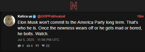 This gives MAGA and POTUS plenty of time to show how regarded Musk’s new party will be.