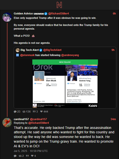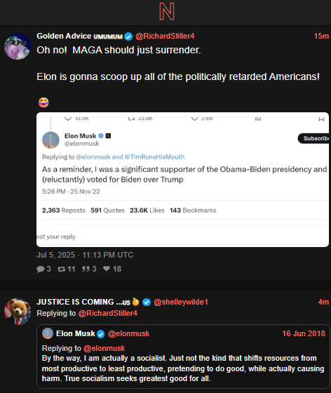 I will NOT advocate for Elon nor will I join his stupid not well thought out third party. But I understand his frustrations…and in no small way, yes, Elon will gain political power over these matters. I think he just now realizes that in order to accomplish the sorts of things this President promised is just not going to happen..so in his mind, he’ll need to do it himself.