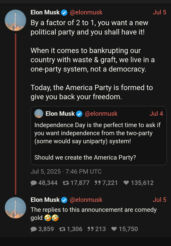 The critical part is mid terms. Do the Deep state/WEF/Anti trump put candidates in the Amercian/Musk party or the MAGA/New REpublican party?