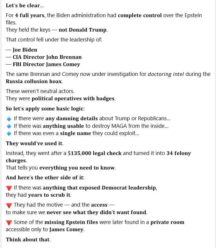 Sundance, I believe (I hate using the word) this is the ‘pragmatic’ approach. We have a nation whose middle class has been decimated purposefully to allow for the installment of a socialist/communist ideology. Team DNC has been building this framework for decades. The power is in creating an economic environment that allows for a thriving middle class -it is the glue that keeps the Democrat Party away from power. The DC bureaucracy and still entrenched interests in the DOJ/FBI will turn this Epstein investigation into a clown show and quite frankly I am more worried about my son’s economic future than attempting to spend precious political capitol chasing this guy and other billionaires sexual proclivities. On the priority list for this nation it is not Epstein and Trump knows this. Its getting Illegal immigrants deported, it is growing our economic engine to the tune of skilled labor jobs, it is resolving the mess we have in Ukraine. I know I don’t and especially my 18 year old son embarking on his college future could care less about Epstein and especially when anyone with a modicum of common sense knows that no one will ever know what went on. Its a distraction.