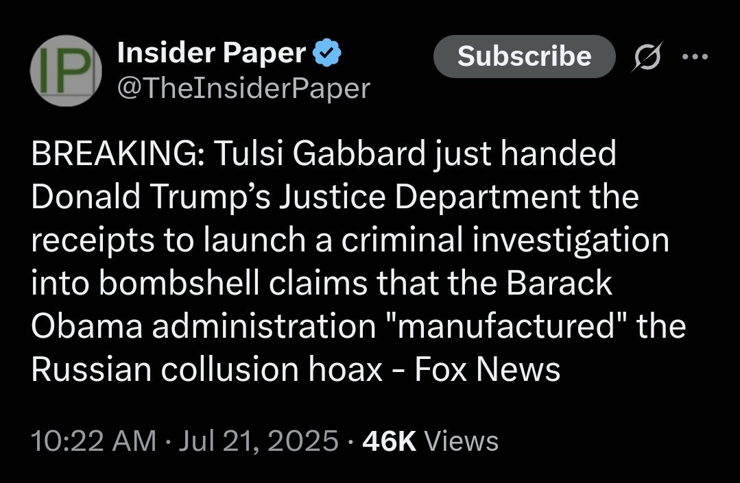 No! All wrong! Tulsi Gabbard is WRONG and this is propaganda: Tulsi Gabbard has revealed NOTHING new except evidence that there was NO conspiracy to create an impression of Russian interference because the Russians were in fact interfering!
