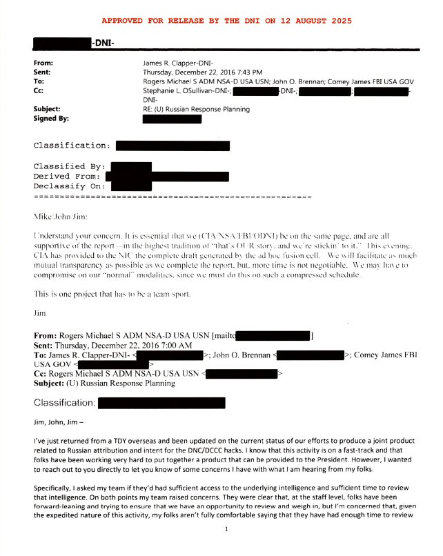 Newly declassified Top Secret emails sent on December 22, 2016 complying with President Obama’s order to create the manufactured January 2017 ICA about Russia expose how DNI James Clapper demanded the IC fall in line behind the Russia Hoax.