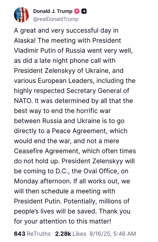 Baier interviewed President Trump on Air Force One going to Anchorage and during the day’s events. In this interview, Baier asked President Trump what his expectations were going in. Trump noted it is not his place to negotiate the terms of a ceasefire on behalf of Ukraine, however, he is willing to be an intermediary in a focused effort to stop the conflict.