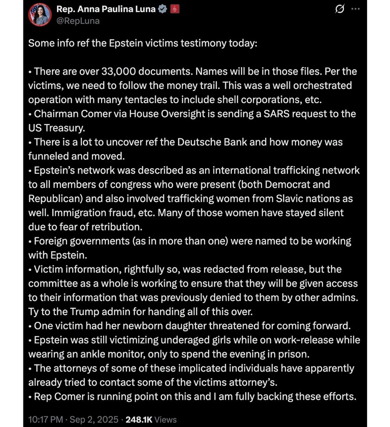 The Epstein story was sensationalized by the media and it’s not at all what the media is making it out to be. Unfortunately too many Republicans (and Democrats) didn’t read the documents that were already released. None of them would be out there holding hearings and demanding more documents if they just read the documents that were already released. All they have to do is read the testimony the girls gave to the detectives.