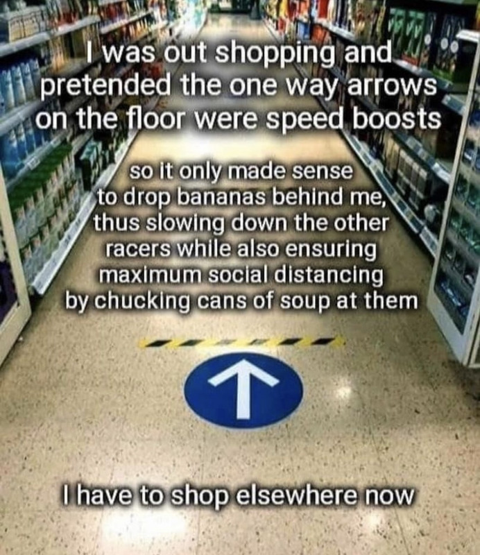 I’m an engineer, so I follow the shortest path to the food I needed in a grocery store. It’s not that I purposely ignored the arrows, I would just never notice what was on the ground. I just don’t understand the people that even think that way. I guess they would also be the ones following the signs on the Road to Serfdom…