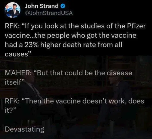 RFK Jr should have large signs behind him, listing each member of congress that received big pharma funds…or at least post it all over the interwebs.