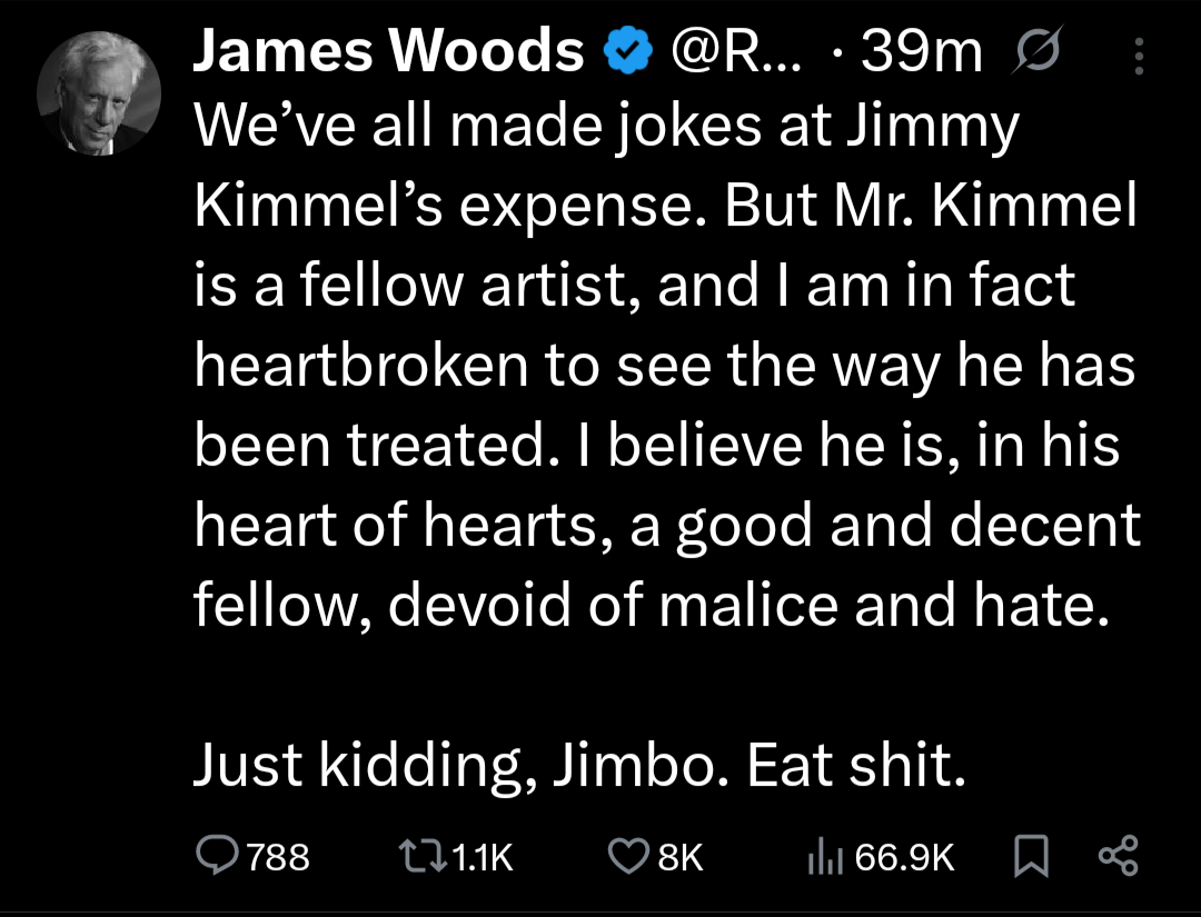 The left is trying to turn the money pit loser into Saint Kimmel, representative of free speech – which they claim they suddenly care about. Grasping at straws, yelling as loudly as they can, hoping we have really short memories.