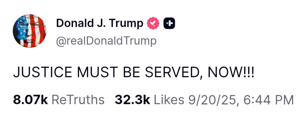 President Trump’s social media post: “Pam: I have reviewed over 30 statements and posts saying that, essentially, “same old story as last time, all talk, no action. Nothing is being done. What about Comey, Adam “Shifty” Schiff, Leticia??? They’re all guilty as hell, but nothing is going to be done.” Then we almost put in a Democrat supported U.S. Attorney, in Virginia, with a really bad Republican past. A Woke RINO, who was never going to do his job. That’s why two of the worst Dem Senators PUSHED him so hard. He even lied to the media and said he quit, and that we had no case. No, I fired him, and there is a GREAT CASE, and many lawyers, and legal pundits, say so. Lindsey Halligan is a really good lawyer, and likes you, a lot. We can’t delay any longer, it’s killing our reputation and credibility. They impeached me twice, and indicted me (5 times!), OVER NOTHING. JUSTICE MUST BE SERVED, NOW!!! President DJT“