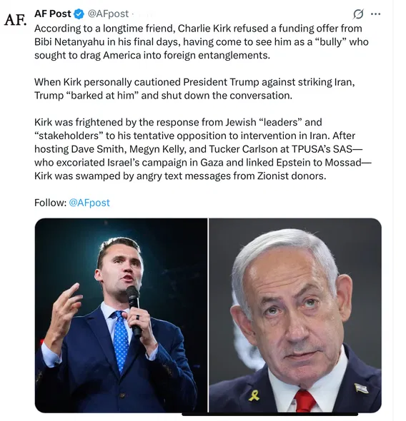 Previously, Charlie Kirk was relaying his concerns to billionaire Bill Ackman about GenZ turning away from supporting Israel. That conversation led to an early August Hampton’s, NY, conference of U.S. influencers organized by Charlie Kirk and financed by Ackman.