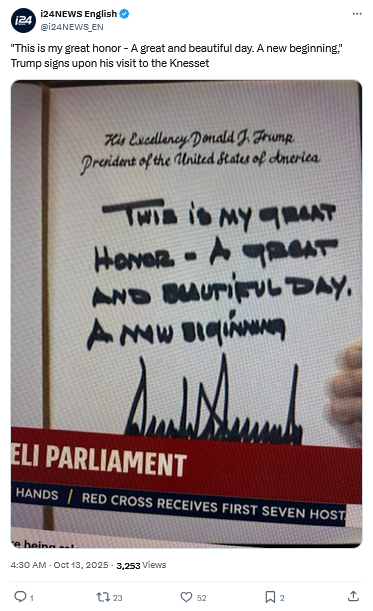 U.S. President Donald Trump arrives in Israel and addresses the Knesset after brokering a historic Gaza ceasefire deal. President Trump travelled from the airport in Tel Aviv together with Israeli Prime Minister Benjamin Netanyahu.